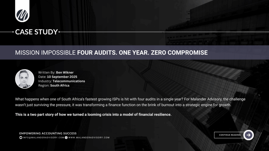 In this two-part case study, Malander Advisory reveals how we helped a high-growth South African telecommunications business transform a looming financial crisis into a long-term strategic win. Faced with four simultaneous audits, limited internal capacity, and intense regulatory scrutiny, the client’s finance team was on the brink of burnout.