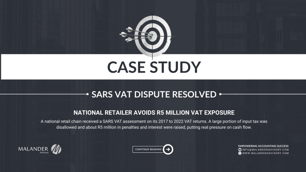 If your business is facing a SARS VAT assessment or dispute, our team can assist with a tailored strategy to achieve a favourable resolution.